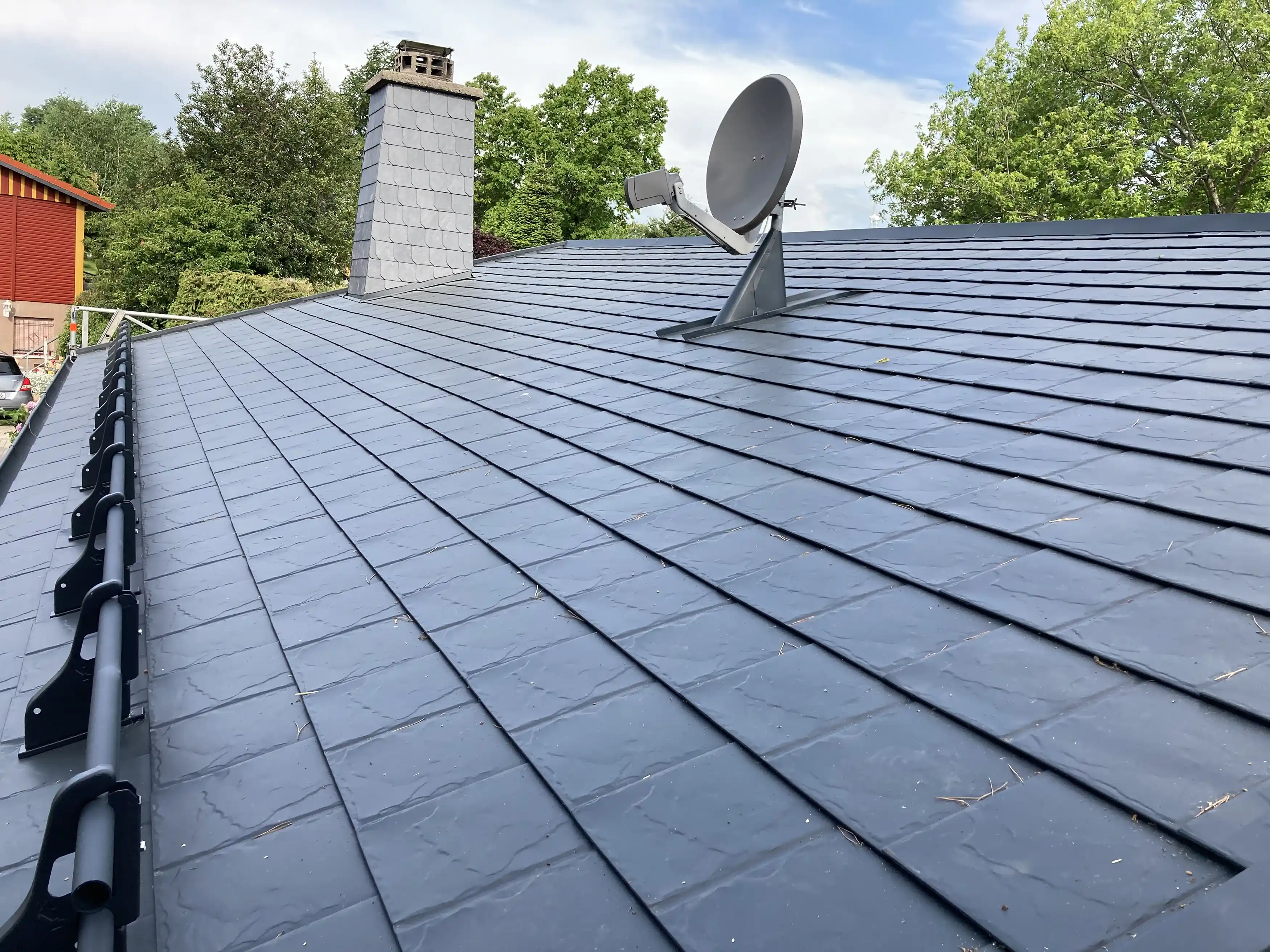 Metalleindeckungen wie Trapezblech oder Aluminiumschindeln bieten eine moderne, robuste Lösung für Dächer jeder Größe. Sie sind besonders leicht, langlebig und pflegearm – ideal auch für große Dachflächen oder industrielle Gebäude.